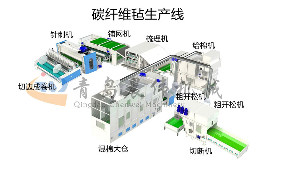 切斷機(jī)-開(kāi)松機(jī)-振動(dòng)給棉機(jī)-梳理機(jī)-鋪網(wǎng)機(jī)-針刺機(jī)-切邊成卷機(jī)
